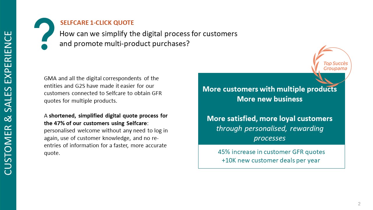 On groupama.fr, customers can easily obtain a personalised quote and purchase products themselves via a fast, personalised digital process without re-entering information or logging back in!
