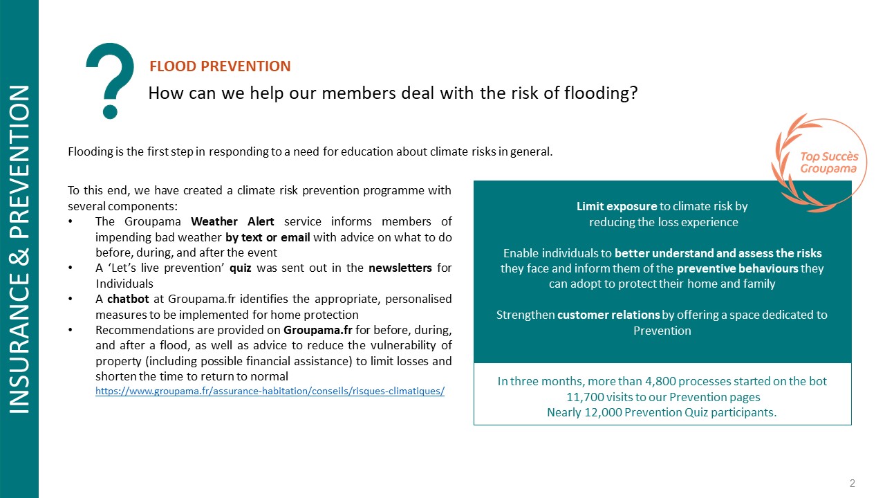 A range of tools deployed to raise awareness among members about flood risk, such as weather alerts by text message or a chatbot.