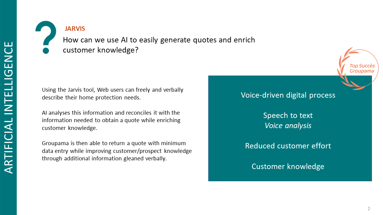 Transcription is at the heart of the JARVIS project: Internet users freely and verbally describe their home protection needs. The AI is then able to provide a quote by with minimum data entry while enriching customer knowledge.