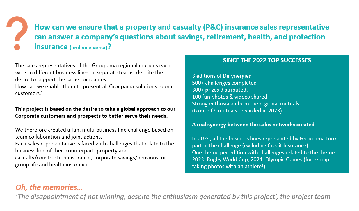 The corporate sales representatives of the Groupama Regional Mutuals each work in different business lines, in different teams… So, to help them sell all our solutions, the Défynergies challenge was created. The goal? To complete as many fun challenges as possible in synergy!