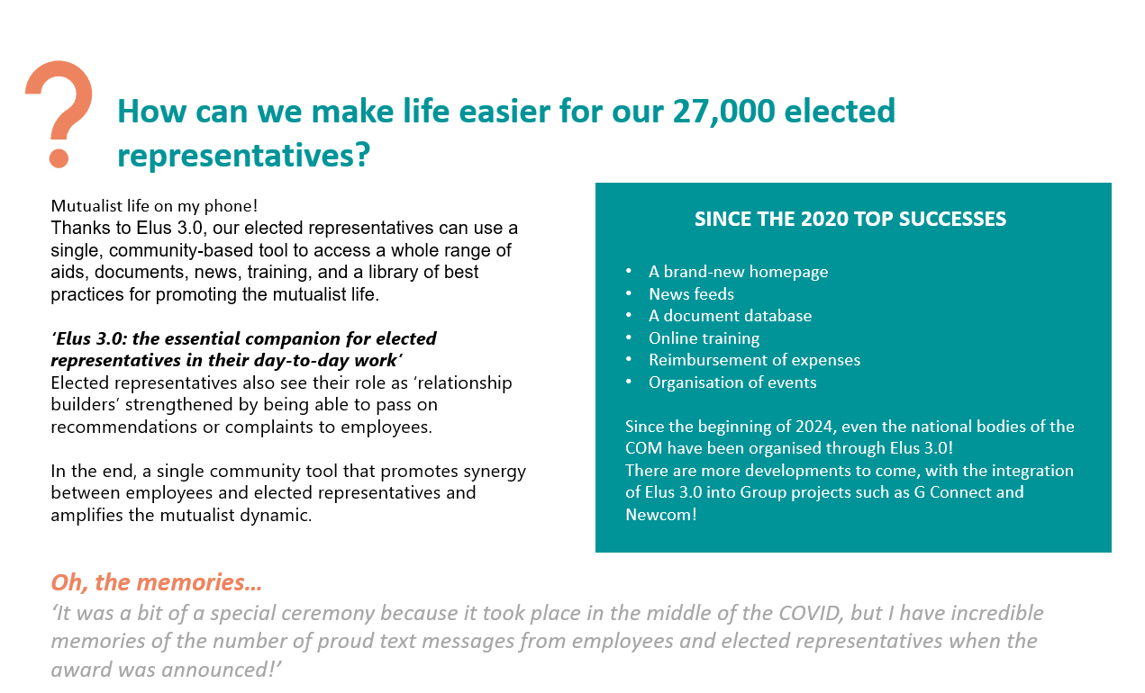 A community tool that gives access to a wide range of functions to help elected representatives promote the mutualist life in their territories and synergy with employees. Starting this year, even the national bodies of the COM have been organised through Elus 3.0!