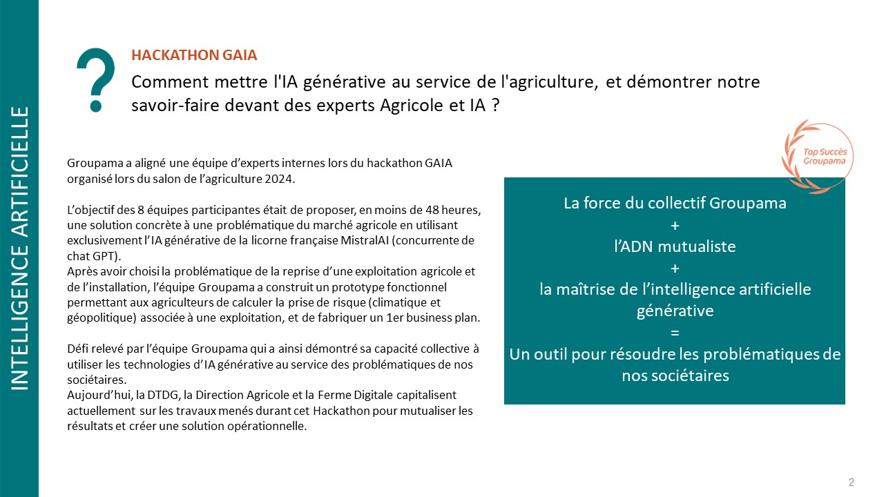 Lors du salon de l’agriculture, une équipe d’experts internes complétée par un agriculteur élu de GCA, a créé en moins de 48h la première interface d’évaluation des risques qui accompagne les agriculteurs dans la reprise ou l’installation d’une exploitation agricole.