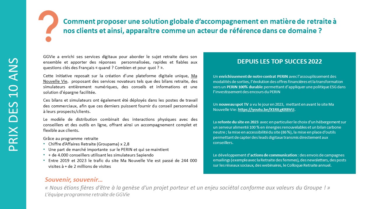 Groupama Gan Vie a conçu un site internet qui propose un accompagnement global à nos clients sur la retraite. Les outils du site sont aussi intégrés aux postes de travail des commerciaux qui peuvent donc prodiguer des conseils personnalisés.